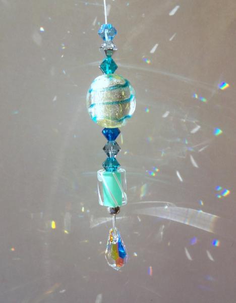 This sun catcher mini Sparkler was created with a 13mm Swarovski Crystal AB Midget Drop complemented with 5mm Swarovski Bicone crystals in six shades of Turquoise and Blues.